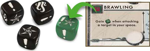 Certain skills and cards may give you bonus green dice, as noted on their description. Some checks may also give you bonus dice if you have a related ability. Finally, reaching certain Insanity Thresholds will add permanent bonus dice to all your rolls.