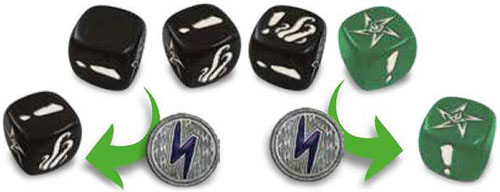 Once you're done using any rerolls, tally the number of each result obtained (note that some die faces contain 2 results). Make sure to apply any symbol changes from abilities (such as counting