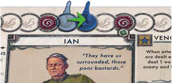Any wounds you take may be applied to Companions you currently have instead. This still counts as you taking wounds for card effects. Companions can never be healed. If their wounds equal the number on their card, the Companion is discarded and any benefit they give you is immediately lost.