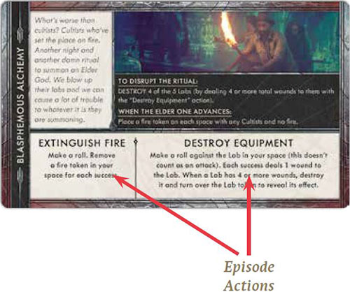 Each episode has 2 unique actions as shown on the episode card. These work just like the standard actions, and will help you disrupt the ritual or help you survive.