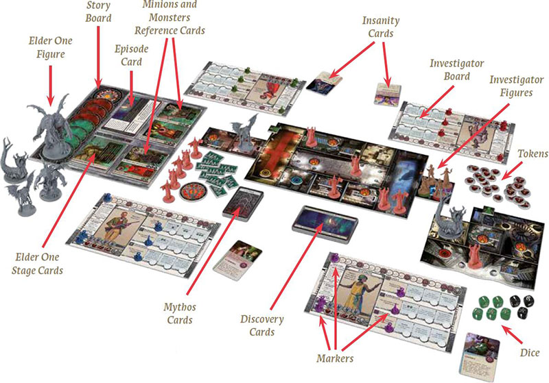 Choose an Elder One. From its box, place the Elder One figure on the starting space of the summoning track. Place the Minions reference card on the Story Board. Set out the 8 Mythos cards and any tokens.