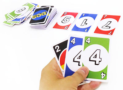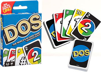 If you ever have EXACTLY TWO CARDS in your hand, you must shout out "DOS!" (meaning "two"). If you forget to do so and another player calls out "DOS!" before you, you must immediately draw two cards as a penalty.