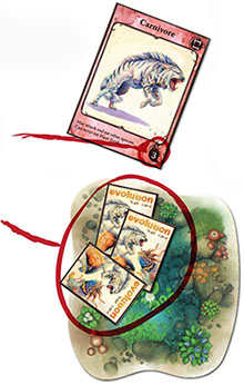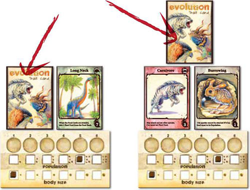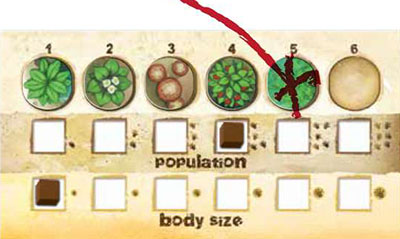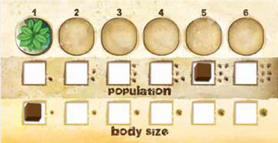 He takes a new Species Board and puts Wooden Markers at Body Size "1" and Population "1". The new species must be placed to the left or the right of his existing species; they may not be placed between existing species.