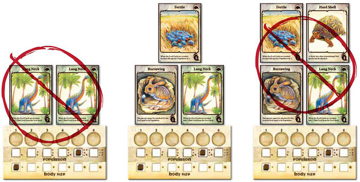 A species may not have any duplicate Trait Cards and may not have more than 3 Trait Cards. If a species already has 3 Trait Cards, a player may play a Trait Card on that species by first discarding a Trait Card that is already on that species.
