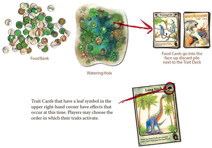 The First Player reveals the Food Cards on the Watering Hole, adds up the food numbers on these cards, and places that much Plant Food from the Food Bank onto the Watering Hole.