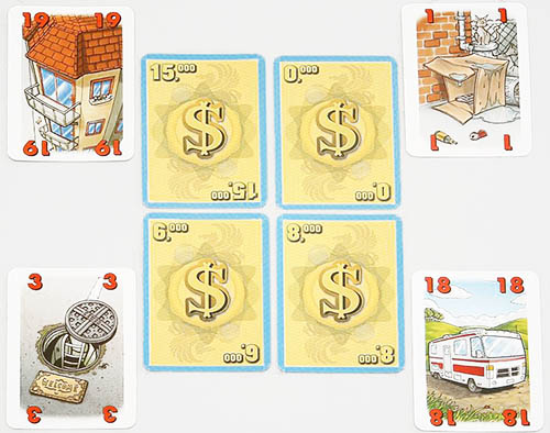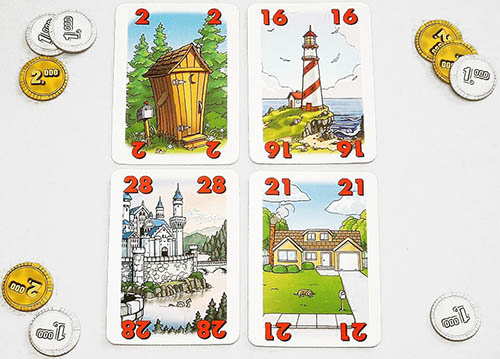 The player who lives in the largest house begins and lays down any number of his Coins onto the table. Play then continues clockwise around the table. The next player must decide whether he will bid or pass.