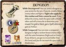 Find and read the Dungeon Description card. No enemy tokens are placed here (for now). This is another adventure site, so like the monster den, you can ignore a dungeon even if you are on its space. You may enter it as your action for the turn.