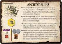 Find and read the Ruin Description card. Ruins are another adventure site where you may move into the space and choose to ignore the site or enter it. But beware, Ruins can contain... well... anything; including the most challenging adventures that can be found in the land.