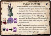 Find and read the Mage Tower Description card. Neutral mage towers behave the same way as neutral keeps, except there is a violet enemy token garrisoned instead of a gray one. As with the keep, this token will be revealed when someone gets close during the Day, but will stay hidden at Night unless a player assaults it.