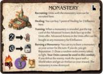 Find and read the Monastery Description card. Any player can recruit Units with the monastery icon t and get healed here. In this respect, a monastery is kind of like an improved village.
