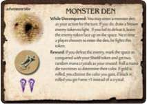 Remember: A monster den, as well as any other adventure sites we will mention later, share a common rule: you may ignore them, i.e. you may move through their space or end your turn on that space without fight, even if there is an undefeated enemy token on that space, if you wish.
