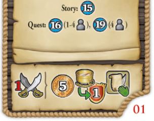 Your rewards for doing so are 5 doubloons, 1 victory point for each compass symbol you have, and the story tile, which you add to your ship boards quest track.