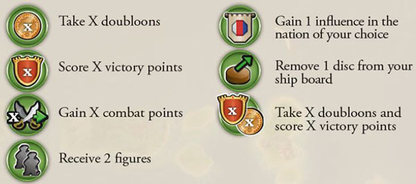 You may pay 2 combat points. If you do, gain 1 influence with the nation of your choice and take 6 doubloons.