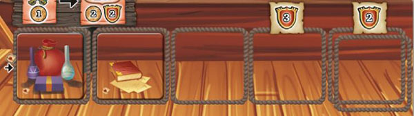 Score 1 victory point for each combat token on your ship board. You may discard all cards in hand. If you do, take 4 doubloons from the supply.