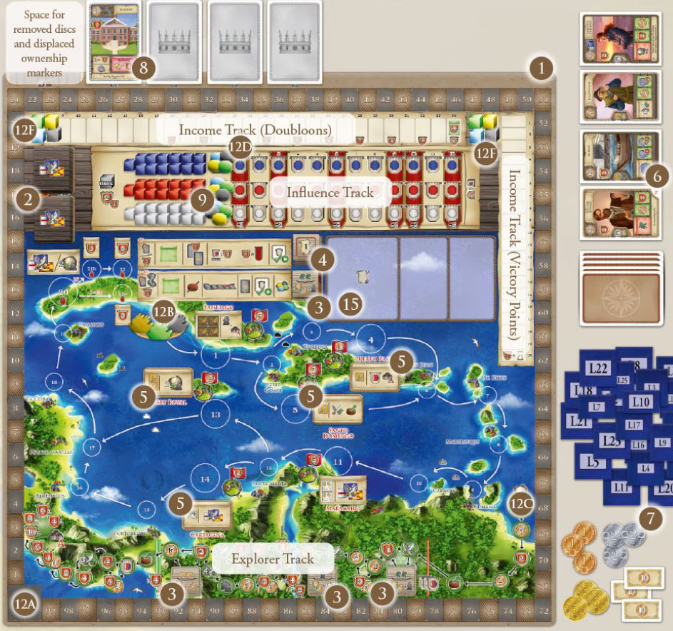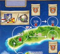 In a 2~player game only immediately place a red ownership marker onto the village at No. 6 (San juan), a white ownership marker onto the village at No. 7 (St. Kitts), and a blue ownership marker onto the village at No. 8 (Martinique). When adding ownership markers to the board, always take the left-most available marker.