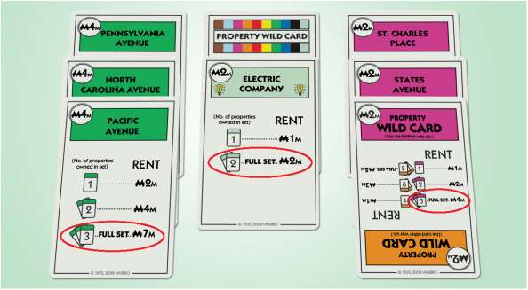 Use Property Wildcards as substitutes for property cards of one of the colors shown on the card.
