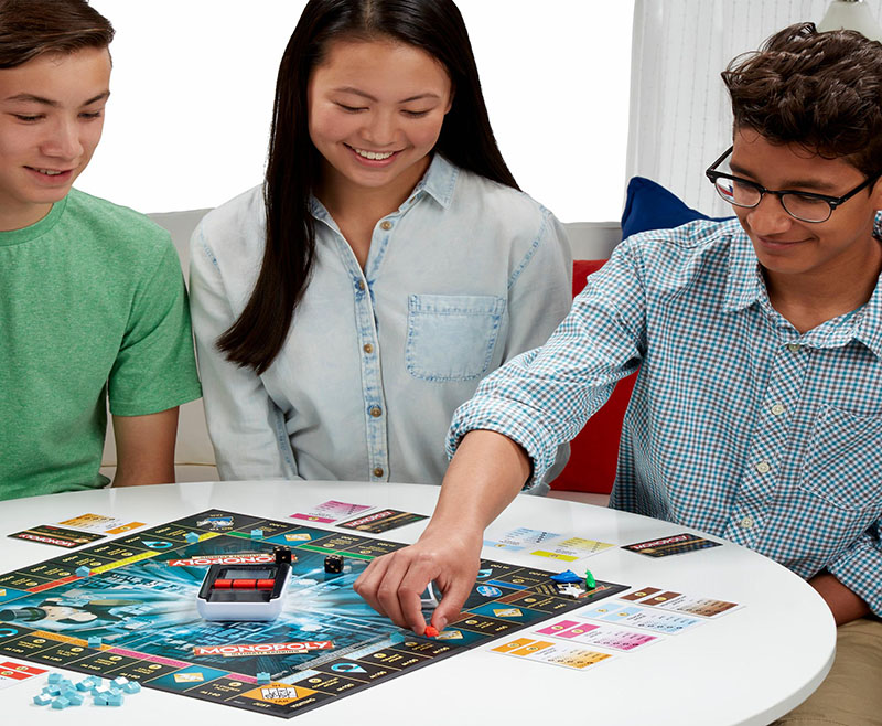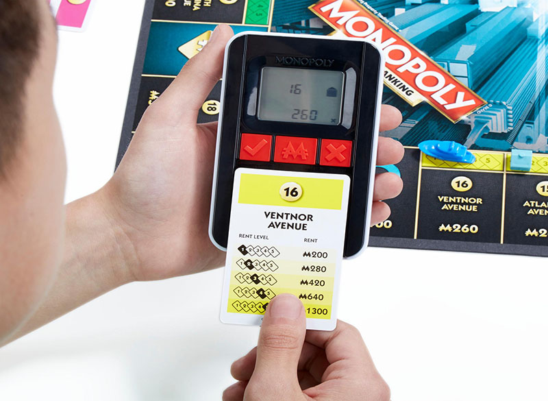 Tap your Bank card to buy it. Board spaces show each property cost. The unit deducts the cost from your balance and, ka-ching, it's yours!