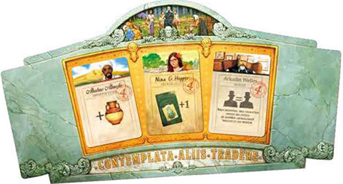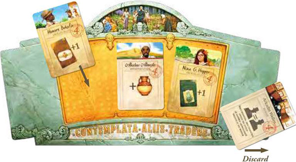 Each player draws 3 cards from the Patron deck, chooses one and discards the other two. For details on the Patron cards and how they work, see "Collections".