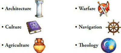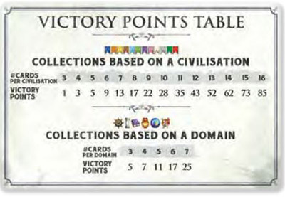 Players earn points for each set of Domain cards they have collected. A Domain Collection is composed of at least 3 cards that possess the same Domain/icon but different Civilizations/colors.