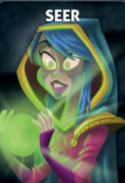 The player with the Seer card opens her eyes and may quietly look at one other player's card or any two of the cards in the center.