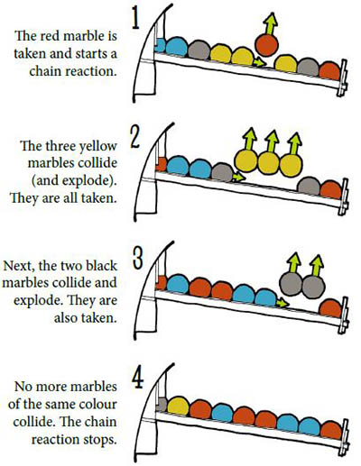 If, after that, another collision between marbles of the same color occurs, a third Explosion will happen, etc. (see the example to the left).