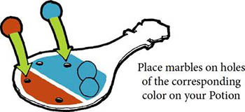 Each Potion recipe may need between 4 and 7 Ingredients. They are represented by the holes on the Potion tiles themselves. Put the marbles of the correct color on your Potion tiles: when all the holes have been filled with a marble of the corresponding color, the Potion is completed.