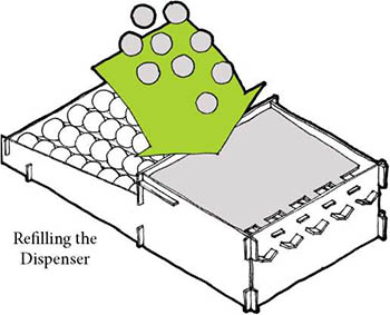 Put all the Ingredient marbles in the "tank" of the Dispenser, and make sure they roll down to completely fill the 5 tracks of the slide.