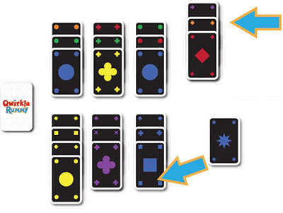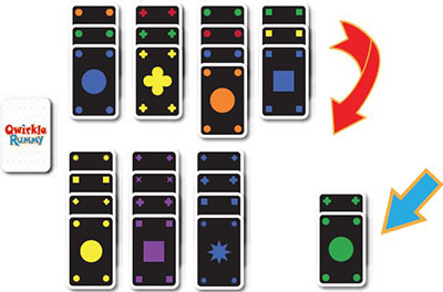 Sally plays the green diamond and the green circle. Then she moves the square from green to complete her run of three.