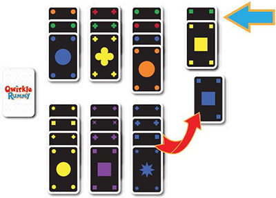 Note: The illustrations below shows the play area after several turns. It works well to have one row for shape sets and one row for color sets.