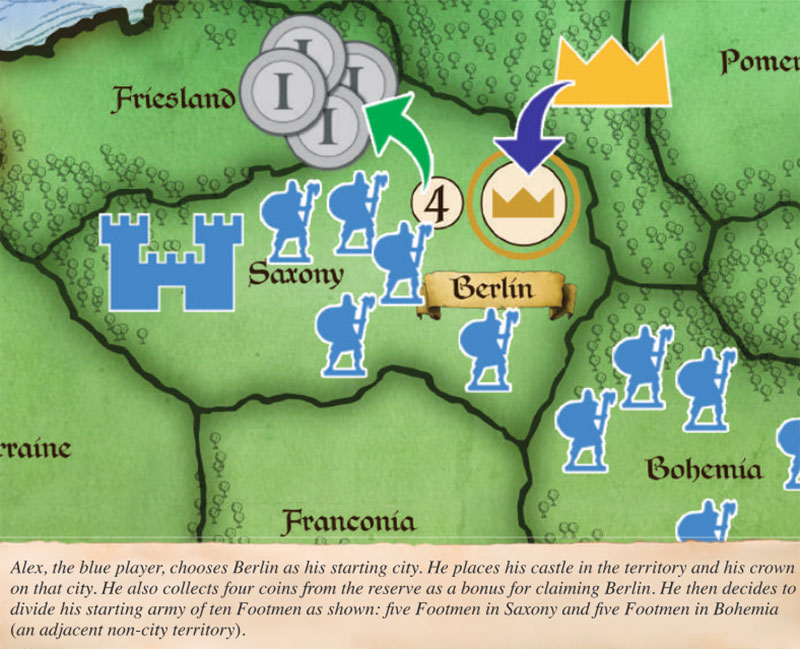 Finally, place ten Footmen, divided in any way you like, between your starting city territory and one adjacent non-city territory.