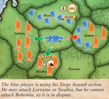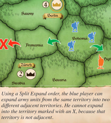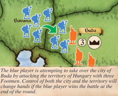 Note: Players may manoeuvre all their army units out of a non-city territory if they choose to do so, but they must leave behind one army unit when leaving city and castle territories.
