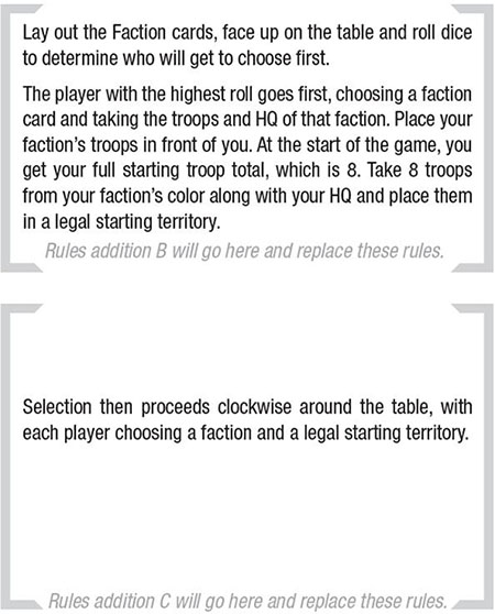Scar Cards: Players will receive a Scar card before some games. These will allow the player to permanently alter a territory on the board or a Faction card.
