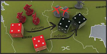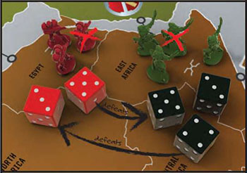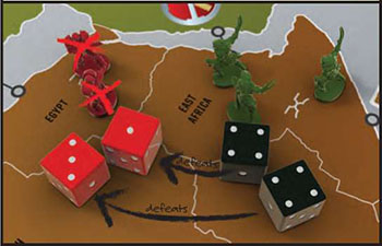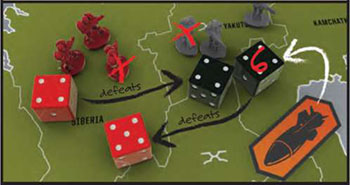 You have dice in two different colors. The 3 black dice are used when attacking. The 2 red dice are used when defending.