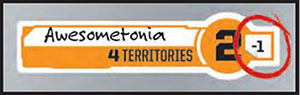 On this board, Awesometonia gives a bonus of 2 troops to anyone who controls it but gives you and you alone a +1 bonus for a total of 3 troops. You may put your initials here to remember you named it.