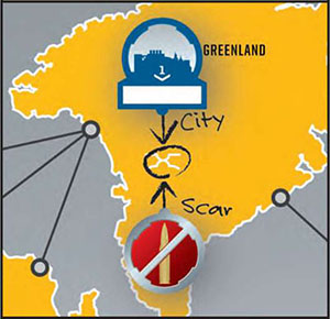 Each territory has a shape showing you where to place marks in that territory. Scars connect to the lower half and cities connect to the upper half. By placing them on the symbols, you make sure that you don't accidentally put two scars in the same territory or cover up a name or put a sticker over a fold in the board, etc.