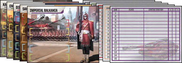 Each army comes with its own Faction card that will evolve as you play more games. The back of the card shows where each Faction started a game (if it was in that game) and whether it won, held on, or was eliminated.