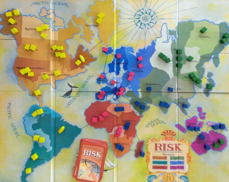This variant is played with the 1975 version of game and adds resources (other than armies) and politics while keeping the game simple (by BGG standards). The three resources are; food (use green armies ~ Asia & Australia), oil (use black armies ~ Europe & Africa), and player armies (North and South America). Food and oil unit (armies) 'stockpiles' are kept hidden until used or traded.