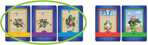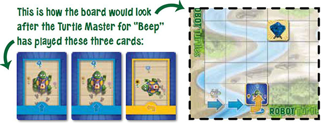 Turtle Masters should place their cards in a line or sequence so that at the end of the game they have one long "program" showing how the Turtle reached the Jewel.