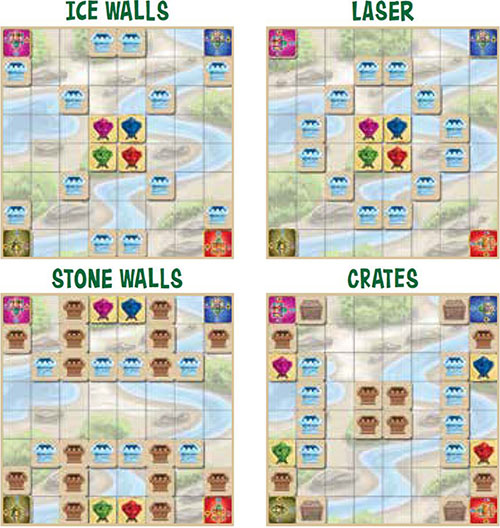 Place Obstacle Tiles on the board before the game begins. Place them however you like as long as they don't trap a Turtle or a Jewel before the game has started.