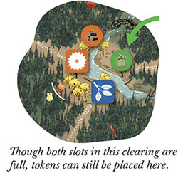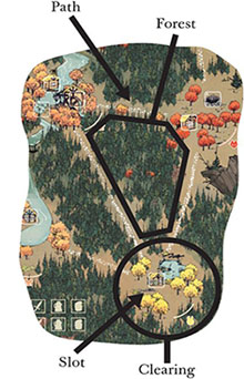 Each clearing on the map has one to three slots, which hold buildings that players will place. A clearing with no open slots cannot hold more buildings.