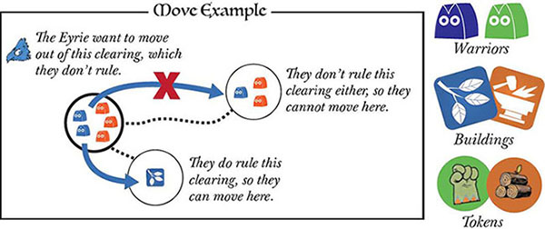 You can move from clearing to clearing. When you move, take any number of your warriors from one clearing and move them to a clearing connected by a path.