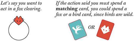 Birds Are Wild: The birds live in the treetops across the whole Woodland, so you can always treat a bird card as a mouse, fox, or rabbit card. However, if you must spend a bird card, you can't substitute a card of another suit.