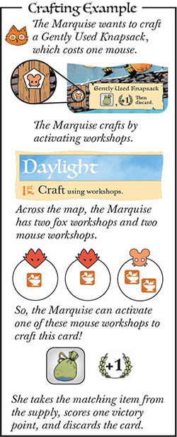 Most cards have a second use-you can craft the card to gain its effect, shown at the bottom. To craft a card, you must activate crafting pieces in the clearings shown in the card's bottom-left corner.