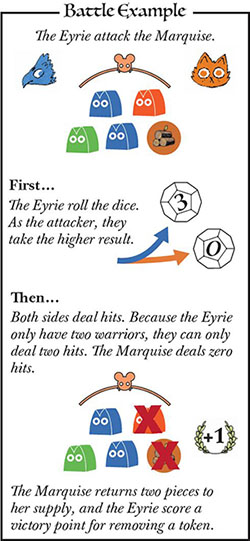 When you battle, choose any clearing where you have any warriors. You are the attacker, and you choose another faction with any pieces there as the defender.