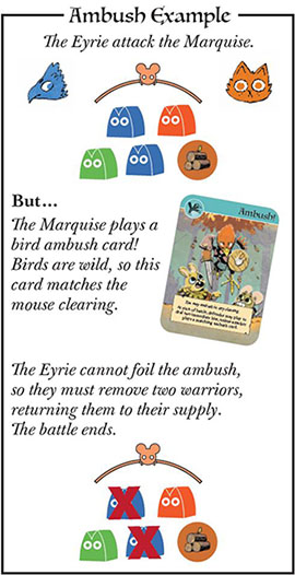 Before the roll in battle, the defender may play an ambush card whose suit matches the clearing of battle to deal two hits immediately.
