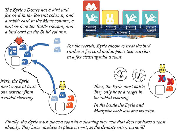 The proud Eyrie Dynasties wish to reclaim the glory of their once-great aristocracy and retake the Woodland from the Marquise. They score each turn by building and protecting roosts in the Woodland.