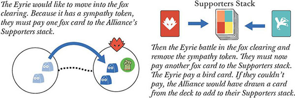 Whenever another player removes a sympathy token or moves any warriors into a clearing with a sympathy token, they must add a card from their hand matching that clearing to your Supporters stack. If they don't have a matching card, they show you their hand, and then you draw a card from the deck and add it to your Supporters stack.