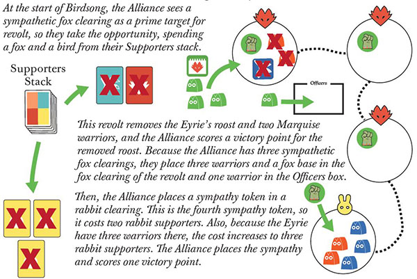 • Revolt: Spend 2nvo supporters matching a sympathetic clearing. Remove all enemy pieces there and place the matching base. Then, place warriors there equal to 2he number of sympathetic clearings matching the suit of the revolt clearing, including the revolt clearing itself. Last, place a warrior in the Officers box.