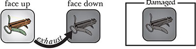 At any time, an item can be damaged or undamaged, and an item can be either face up or down. You can exhaust an undamaged face-up item to perform an action.