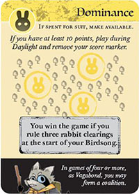 During your Daylight, if you have at least 10 victory points, you may play a dominance card into your play area to activate it. Remove your score marker from the score track. For the rest of the game, you can only win by meeting the victory condition listed on your activated dominance card.